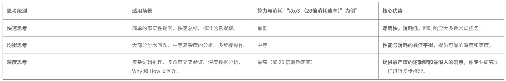 在超长上下文模式的基础上,我们引入了突破性的 深度思考模型( Deep Reasoning Mode),它提供了三种精细的思考级别,让 AI 的推理过程透明且可控: